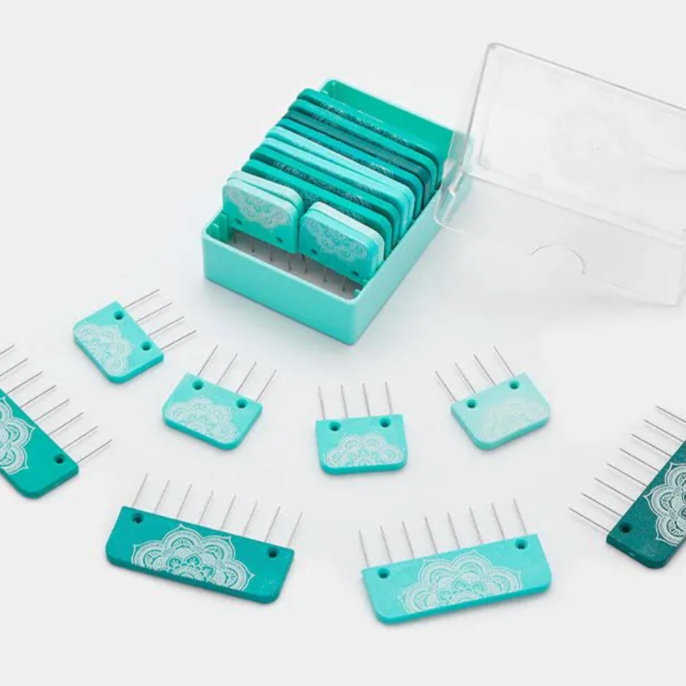 Each blocker features strong, rust-resistant pins embedded in a smooth, easy-to-grip base in a soothing Mindful Collection turquoise. The pins are spaced evenly to hold your knitted or crocheted fabric flat and taut while it dries, resulting in professional, crisp edges and perfectly shaped projects.