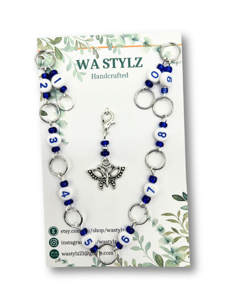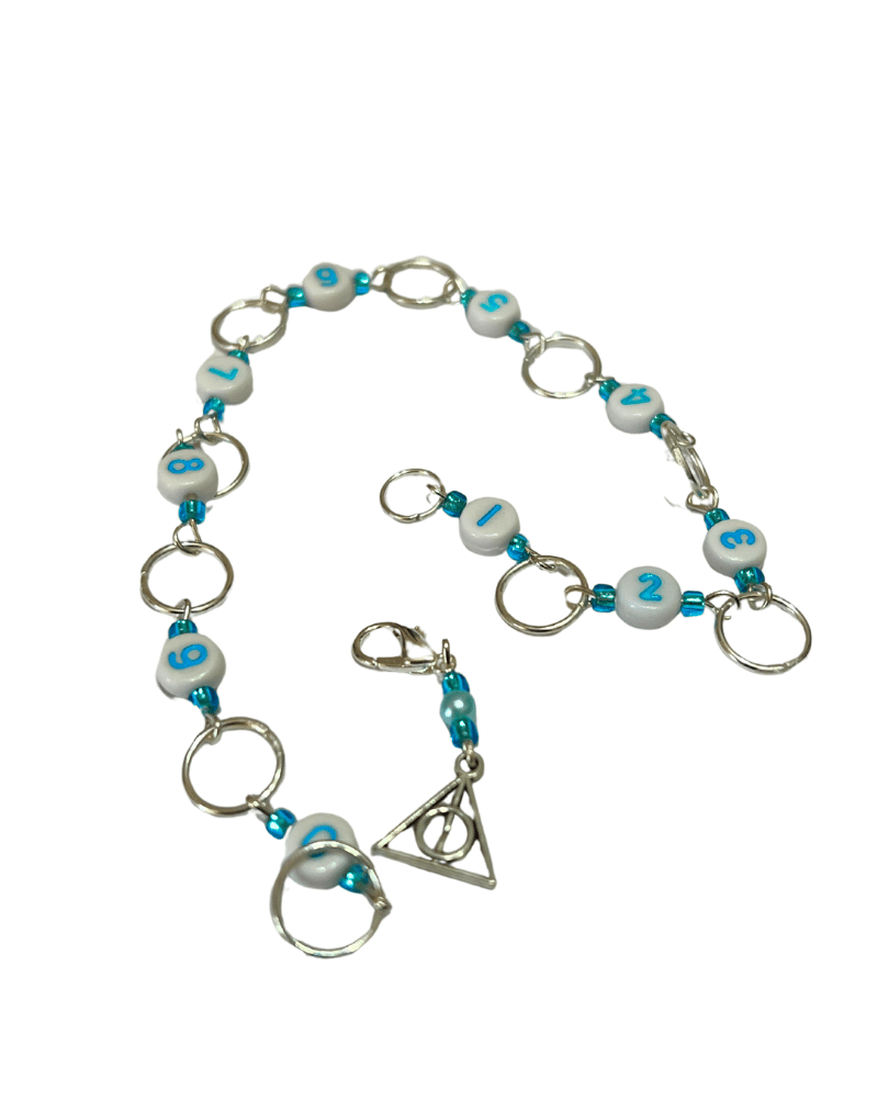 A beautiful blue and white bead and silver 10 mm jump rings that you can see on any knitting project.